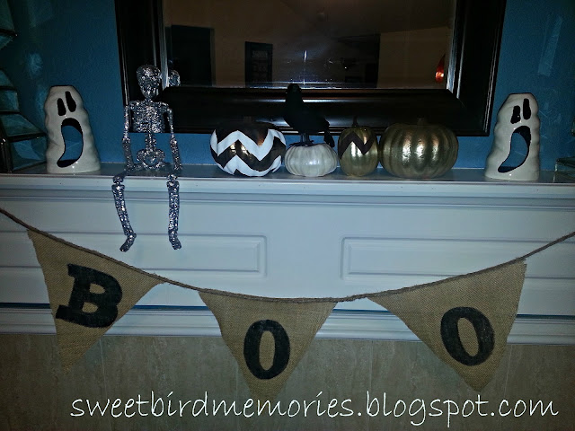 I have seen several of these pennant burlap banner all over Pinterest and Im sure you have too! I have been wanting to make one for a while now so I thought this would be the perfect opportunity! I stenciled the letters onto the burlap and painted it with black acrylic paint. I attached jute rope to the top of the banner with the hot glue gun. And there you have it, a spooky banner! :)